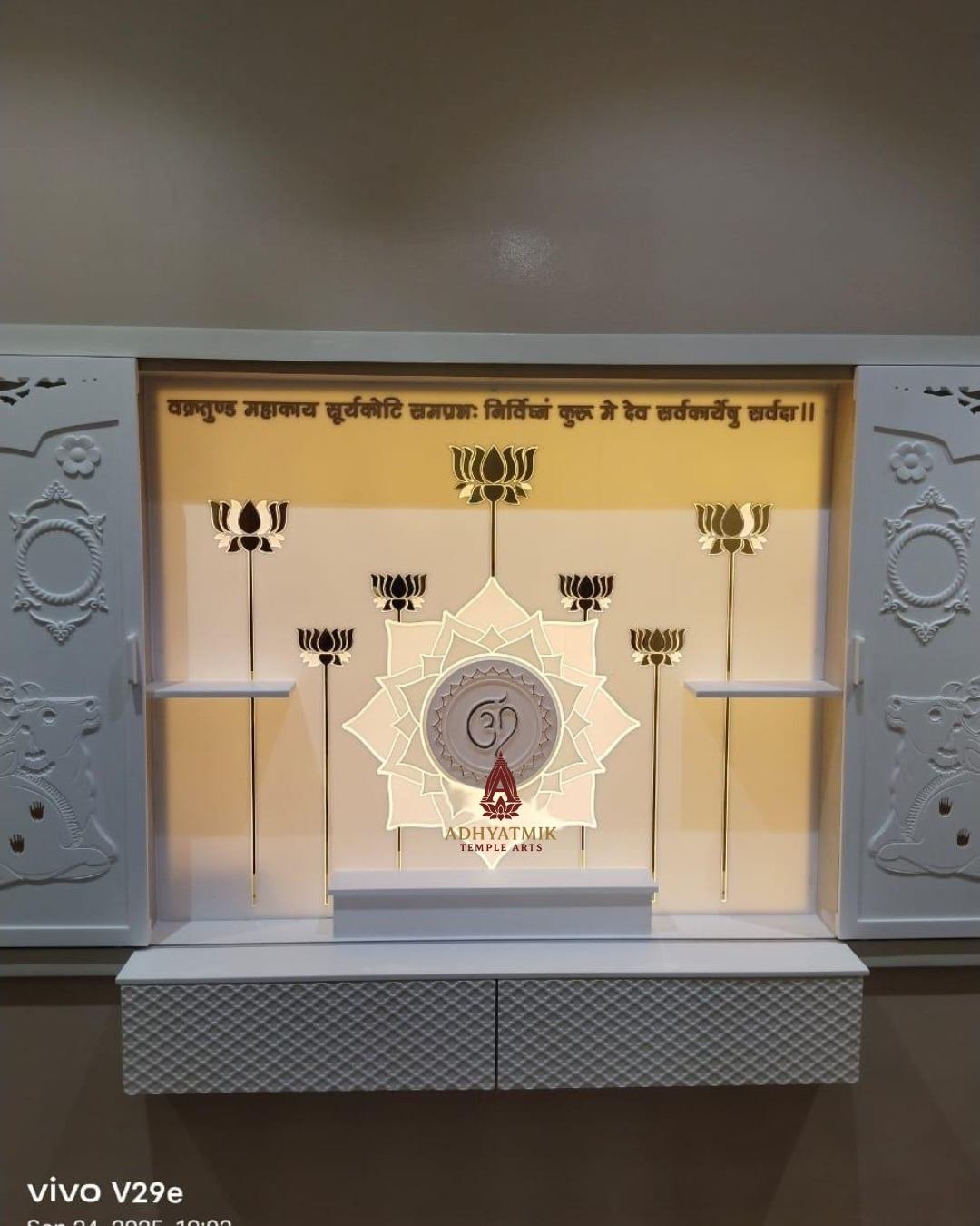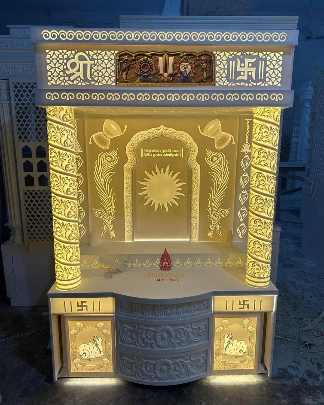 Corian is one of the most preferred materials for modern mandirs and designer wall panels because of its purity, durability, and seamless beauty. Made from high-quality solid-surface material, Corian offers a smooth, jointless finish that looks elegant in any home. Its pure white appearance, ability to be backlit with soft LED lighting, and capacity for detailed engraving make it ideal for spiritual spaces where calmness and sophistication are essential.